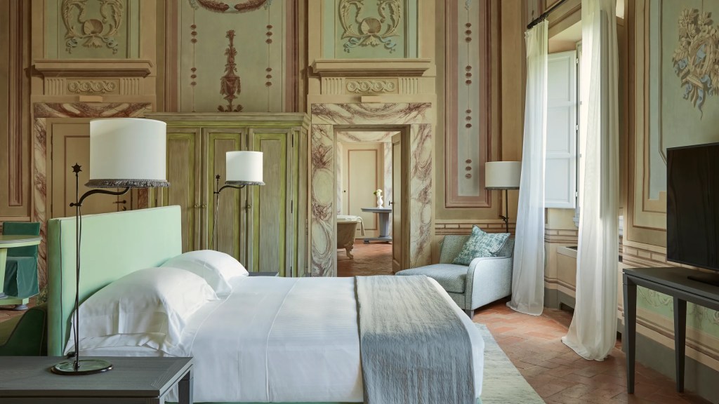 A 12th-century castle turned five-star retreat, COMO Castello Del Nero sits on 740 acres in the Chianti countryside. Interiors fuse Renaissance details—frescoes, vaulted ceilings, antique fireplaces—with sleek, modern design by Paola Navone.