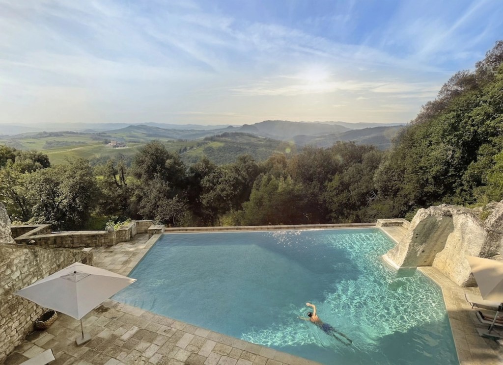 Expect sweeping countryside views, custom-made furniture, and serene, airy suites. The estate includes a Roman-style spa, infinity pool, and curated nature experiences.