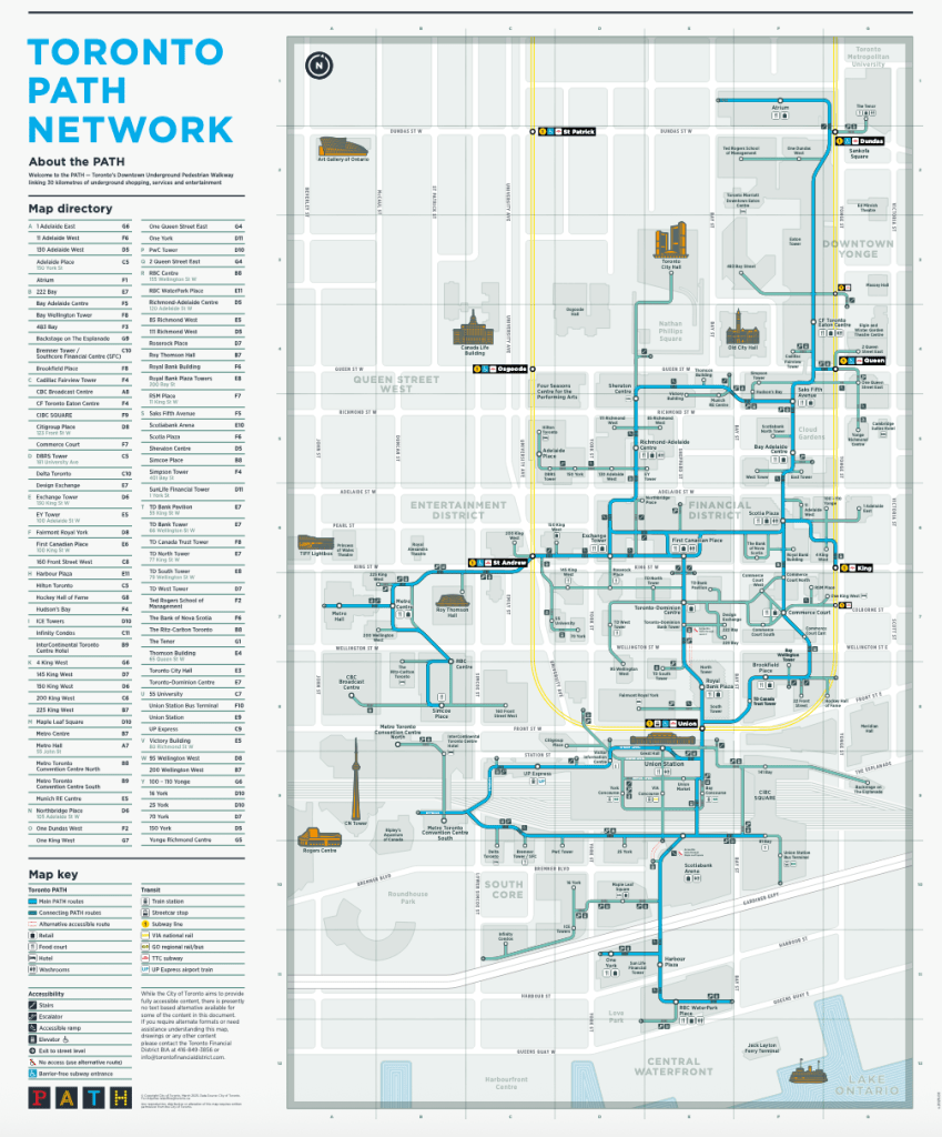 Toronto’s PATH system was created to help people move comfortably through downtown—especially during the city’s harsh winters and humid summers. The idea was simple: give pedestrians a weather-protected alternative to street-level travel, while also connecting key office towers, transit hubs, and shopping areas.